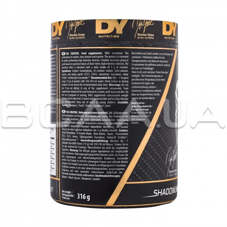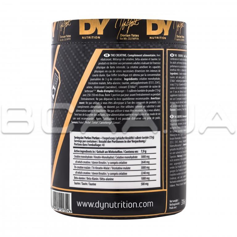 - DY The Creatine - є натуральною сполукою (азотовмісна карбонова кислота), яка покращує приплив енергії до м'язів і дозволяє швидко збільшити витривалість і силу. Професійним спортсменам, які звикли до максимальних навантажень, звичайного креатину може не вистачити. Крім звичайного креатину в ньому присутня Три-креатин, яблучна кислота, Таурин і Бета-аланін.