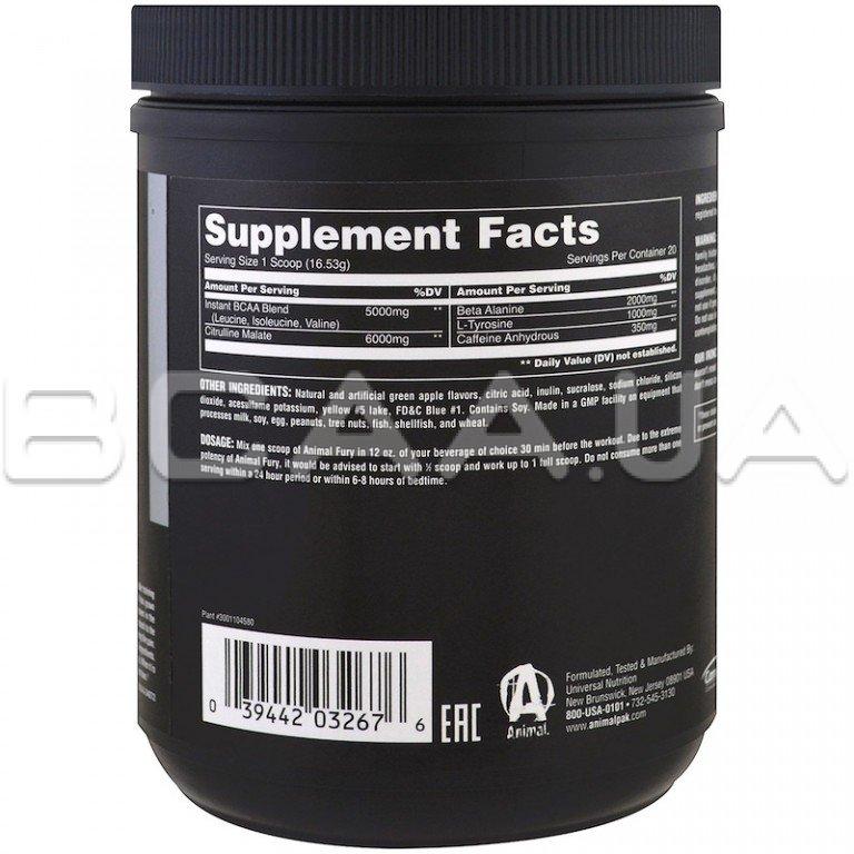 Animal Fury, Universal Nutrition – це якісний передтренувальний комплекс, що є лідером продажів на ринку спортивного харчування. Підходить для людей, які прагнуть якнайшвидше досягти продуктивності та високого рівня тренувань. Передтреник можна використовувати атлетам практично будь-якого напрямку – бодібілдерам, плавцям, боксерам, бігунам, фітнес-тренерам і т. д.