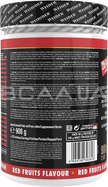 - Weider, Fruity Isolate - це високоякісний ізолят сироваткового білка, спеціально розроблений для вживання виключно у поєднанні з водою. Крім незрівнянно чудового смаку, він вражає, перш за все, своєю неперевершеною поживною цінністю та високим вмістом незамінних амінокислот (BCAA) та амінокислот з розгалуженим ланцюгом (EAA). Одна порція свіжого протеїнового фруктового коктейлю містить цілих 24 г чистого сироваткового білка і всього 110 калорій, 0,4 г жиру і 0,5 г цукру!
