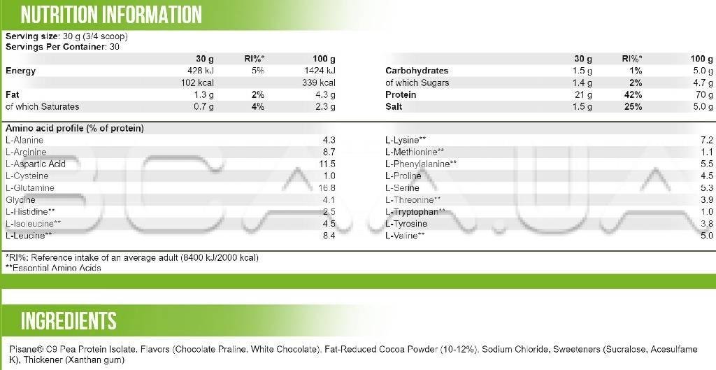 100% Plant Protein основан на одном из лучших, высоко чистом сырье: бельгийском Pisane® изоляте горохового белка, произведённом из локально выращенного желтого гороха. Это абсолютно естественный процесс и поэтому продукт не содержит ГМО. 100% Plant Protein является продуктом с содержанием белка около 90%! Способ получения чистейшего растительного изолята называется экстракцией. Он проходит на основе уникального водного процесса, не используя органических растворителей или гексан. Экологически чистый 100% Plant Protein действительно очень "зеленый" и потому, что горох выращивают на местном уровне, где азотистые минеральные удобрения практически не применяются.
