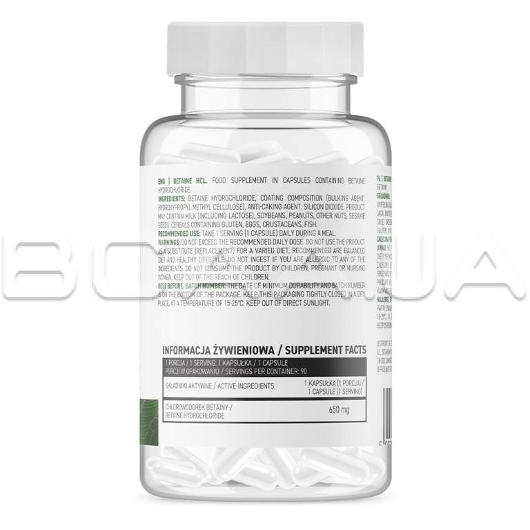 - Бетаїн, також званий триметилгліцин, - це амінокислота, яка виконує ряд функцій в організмі людини, у тому числі бере участь у перебігу численних фізіологічних процесів. Бетаїн HCl регулює рівень соляної кислоти, завдяки чому покращує процес перетравлення білків, підтримує синтез амінокислот, а також захищає організм від проникнення до нього патогенних вірусів. Крім того, вживання бетаїну регулює засвоєння вітаміну B12, а також знижує рівень гомоцистеїну. Він також відомий здатністю підвищувати м'язову силу та зменшувати стомлюваність.