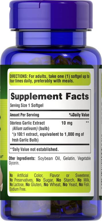 Puritan's Pride, Odorless Garlic Extract 1000 mg — це харчова добавка на основі екстракту часнику без запаху, отриманого методом холодної обробки.