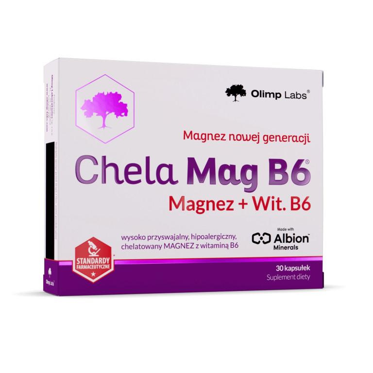 - Olimp Labs, Chela-Mag B6 – це харчова добавка, що містить добре засвоювану формулу магнію у вигляді амінокислотного хелату Albical® (бісгліцинат магнію), збагаченого вітаміном B6, який взаємодіє з магнієм у метаболічних процесах.