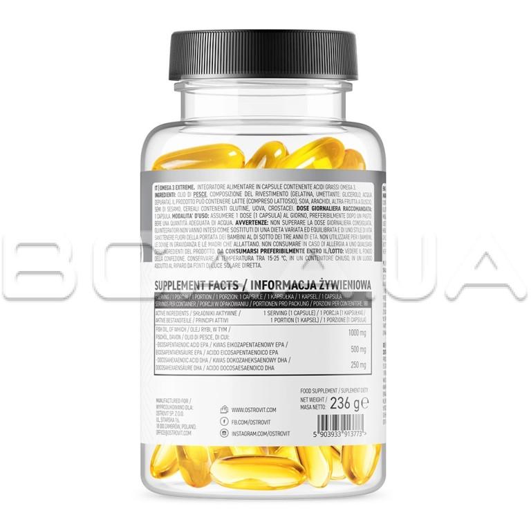 - Ostrovit, Omega 3 Extreme - це харчова добавка, яка забезпечує організм до 1000 мг риб'ячого жиру в одній порції продукту. У той же час препарат є джерелом значної кількості цінних ненасичених жирних кислот, таких як ейкозапентаєнова кислота (ЕПК) та докозагексаєнова кислота (ДГК).