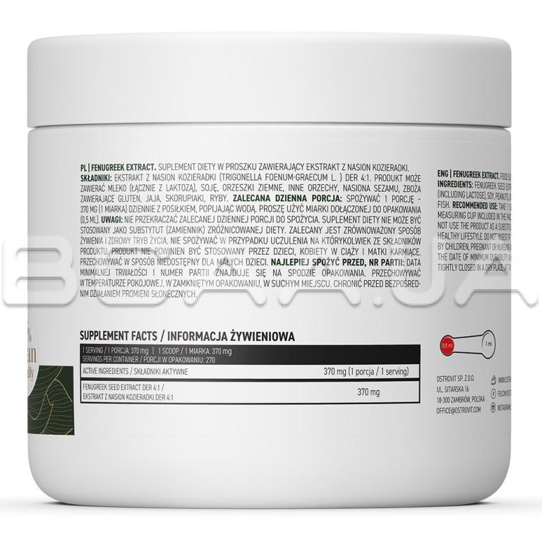 - Ostrovit, Fenugreek Extract – це високоякісна харчова добавка, що містить екстракт насіння пажитника. Цей продукт з простим складом, що не містить непотрібних добавок та наповнювачів і доступний у вигляді порошку, який відмінно підходить як доповнення до вашого щоденного раціону.