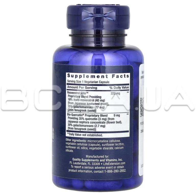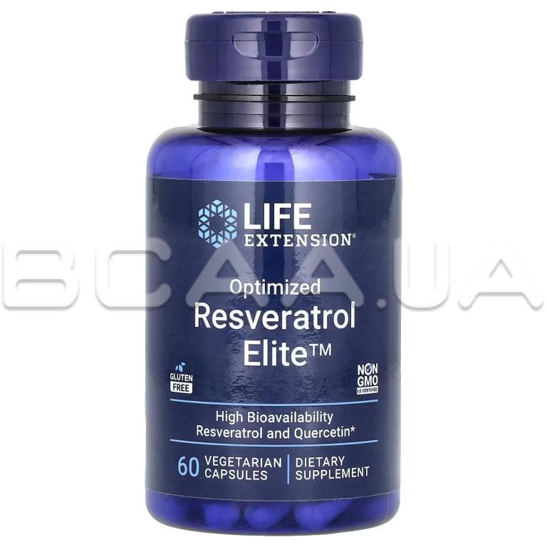 - Life Extension, Optimized Resveratrol Elite містить потужну суміш транс-ресвератролу та інших поліфенолів, призначених для підтримки довголіття та загального здоров'я. Ця формула поєднує ультрабіодоступний ресвератрол з кверцетином для підтримки оптимальної клітинної функції, здоров'я серцево-судинної системи та запальної реакції організму.