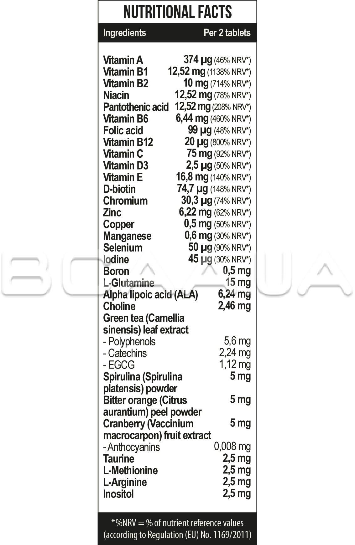 Інгредієнти: Наповнювач (целюлоза), антизлежувачі (карбонат кальцію, магнієві солі жирних кислот, діоксид кремнію), л-аскорбінова кислота, дл-альфа-токоферилацетат, стабілізатор [полівінілпіролідон (PVP)], ціанокобаламін гідрохлорид тіаміну нікотинамід, рибофлавін, гідрохлорид піридоксину, оксид цинку, альфа-ліпоєва кислота, бітартрат холіну, зелений чай (Camellia sinensis) екстракт листя (стандартизований до 40% поліфенолів, 20% катехінів та 7% EGCG), порошк шкірки гіркого апельсина (Citrus aurantium), екстракт плодів журавлини (Vaccar) 15% антоціанів), ретинілацетат, борна кислота, таурин, л-карнітин, л-тартрат, л-метіонін, л-аргінат, інозит, сульфат, селеніт натрію, птероїлмоноглутамінова кислота, д-біотин, йодид калію, піколінат хрому (III), холекальциферол.