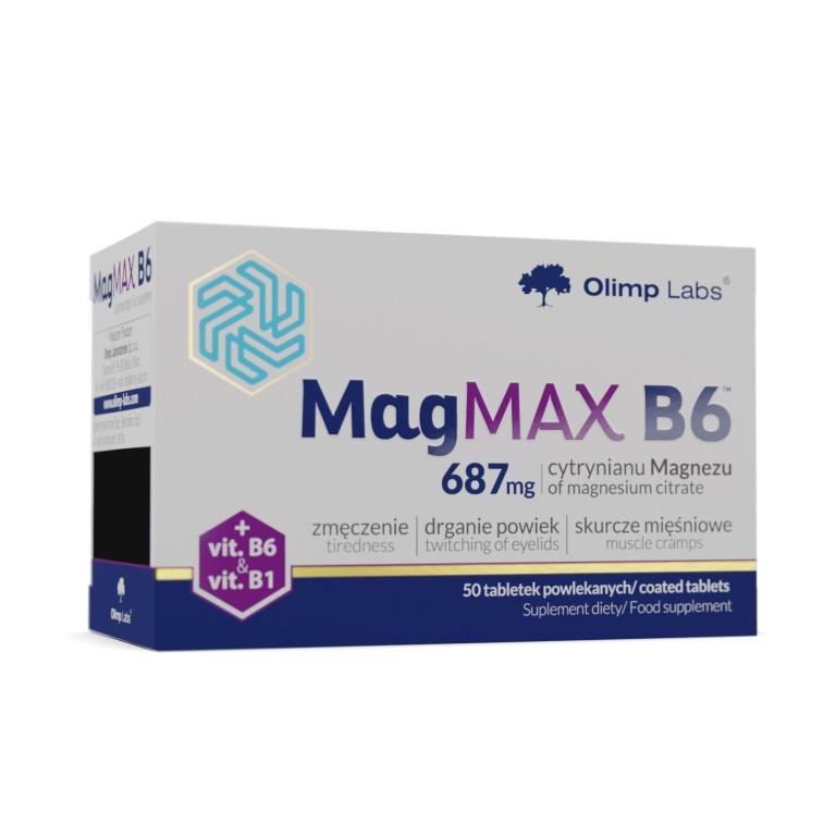 - Olimp Labs, MagMAX B6 — це дієтична добавка у формі таблеток, що містить магній у вигляді цитрату магнію, доповнений вітаміном B6 і тіаміном (вітаміном B1).