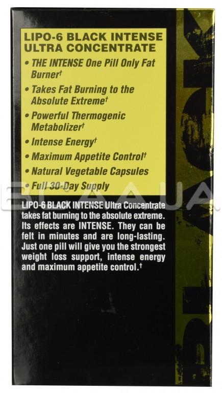 - Lipo-6 Black Intense - доводить спалювання жиру до абсолютного максимуму. Вона надає інтенсивні ефекти. Всього одна таблетка надасть найефективніше сприяння в спалюванні жиру, різко збільшить заряд енергії і дозволить контролювати свій апетит.