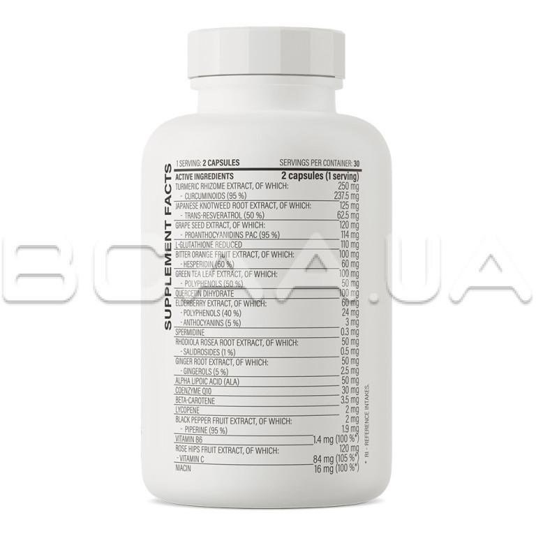 Ингредиенты: Куркума экстракт корневища - 95% куркуминоидов, наполнитель: гидроксипропилметилцеллюлоза; экстракт плодов шиповника - 70% витамина С, экстракт корня горца японского - 50% транс-ресвератрола, экстракт виноградных косточек - 95% проантоцианидинов (PAC), L-глутатион восстановленный, экстракт плодов горького апельсина - 60% гесперидина, экстракт листьев зеленого чая - 50% полифенолов, кверцетина дигидрат (из плодов Sophora japonica L.), бета-каротин, экстракт бузины - 40% полифенолов и 5% антоцианов, экстракт корня родиолы розовой - 1% салидрозидов, экстракт корня имбиря - 5% гингеролов, альфа-липоевая кислота (АЛК), ликопен, экстракт зародышей пшеницы (Triticum aestevium), богатый спермидином, убихинон (коэнзим Q10), инозитол гексаникотинат (ниацин), противослеживающее средство агент: магниевые соли жирных кислот; экстракт плодов черного перца - 95% пиперина, пиридоксаль 5’-фосфат (витамин B6).