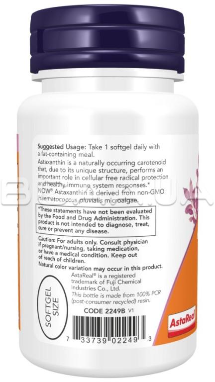 - Астаксантин благодаря своей уникальной структуре играет важную роль в защите клеток от свободных радикалов и здоровых реакциях иммунной системы. Астаксантин от Now Foods получен из не содержащих ГМО микроводорослей Haematococcus pluvialis.