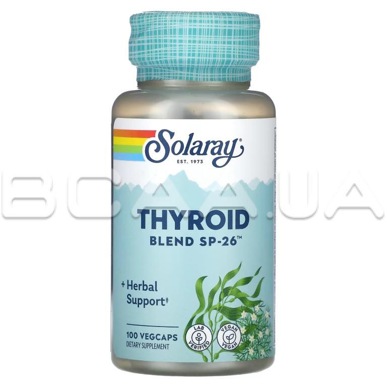 - Щитовидная железа может влиять практически на все процессы в организме, включая метаболизм, сердце, мозг, мышцы и пищеварительные функции. Формула Solaray, Thyroid Blend SP-26 разработана, чтобы помочь щитовидной железе выполнять ее функцию. Фирменная смесь из ламинарии, ирландского мха, элеутерококка, горечавки, пажитника и кайенского перца — трав, богатых такими питательными веществами, как йод, который может использоваться для выработки гормонов щитовидной железы.