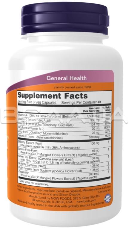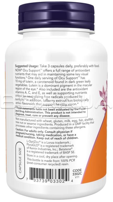 - Now® Foods, Ocu Support™ предлагает полный спектр антиоксидантных питательных веществ, которые могут помочь в поддержании некоторых ключевых зрительных функций. Одна ежедневная порция этой пищевой добавки содержит 10 мг лютеина, каротиноида, содержащегося в темно-зеленых листовых овощах. Лютеин является доминирующим пигментом в макулярной области глаза. Также включены антиоксидантные витамины A, C и E, а также поддерживающие питательные вещества, необходимые для нейтрализации свободных радикалов, вырабатываемых солнечным светом. Кроме того, экстракт черники содержит биологически активные флавоноиды, которые поддерживают здоровое зрение.