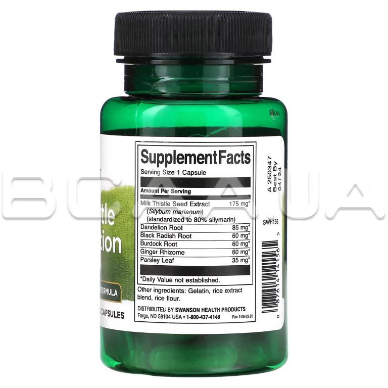 - Swanson, Milk Thistle Combination — это травяной тоник для ежедневной поддержки здоровья печени, содержащий экстракт расторопши с гарантированной эффективностью (стандартизированный до 80-процентного содержания силимарина). Формула дополнительно обогащена травами, очищающими печень, включая корень одуванчика, корень черной редьки, корень лопуха, корень имбиря и корень петрушки. Этот травяной комплекс также положительно влияет на здоровую функцию селезенки и почек.