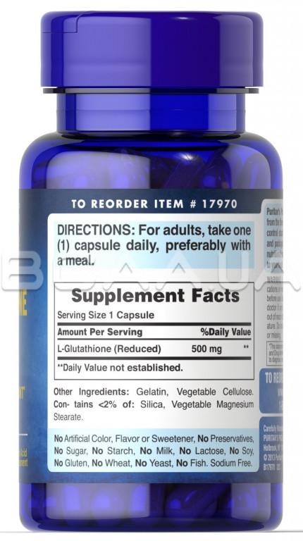 Описание Puritan's Pride, L-Glutathione 500 mg (Глутатион), 30 Rapid Release Capsules