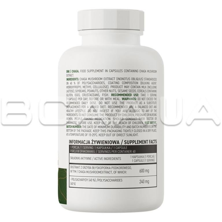 Ингредиенты: Экстракт гриба чаги (Inonotus obliquus), стандартизированный до 40% полисахаридов DER 20:1, оболочка капсулы (наполнитель: гидроксипропилметилцеллюлоза).