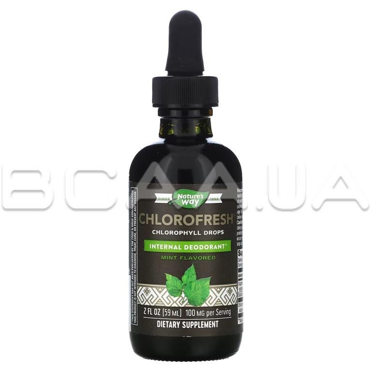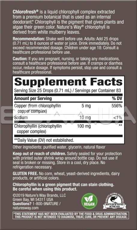 - Nature's Way, Chlorofresh, Chlorophyll Drops — это жидкий комплекс хлорофиллина и меди, который поддерживает антиоксидантные пути и процессы детоксикации, а также помогает нейтрализовать свободные радикалы. Он также поддерживает синтез коллагена и сохраняет ощущение свежести, работая как внутренний дезодорант. Хлорофилл — это пигмент, который придает растениям и водорослям зеленый цвет. Хлорофилл от Nature's Way® получают из листьев белой шелковицы.