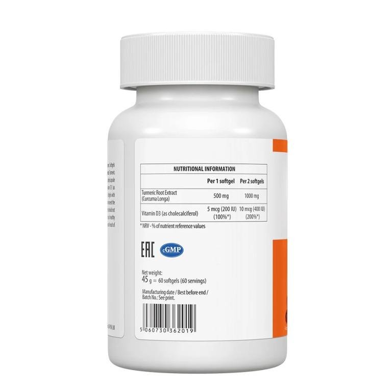 Ингредиенты: экстракт корня куркумы (Curcuma longa), подсолнечное масло, капсула (желатин, увлажнитель (глицерин), вода), витамин D3 (в форме холекальциферола).