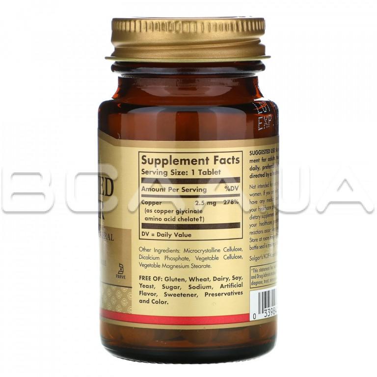 Описание Solgar, Chelated Copper, 100 Tablets