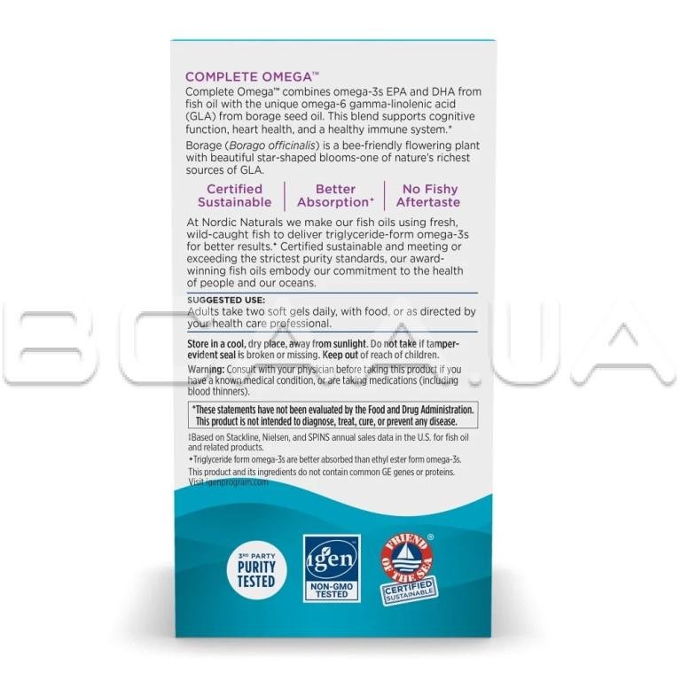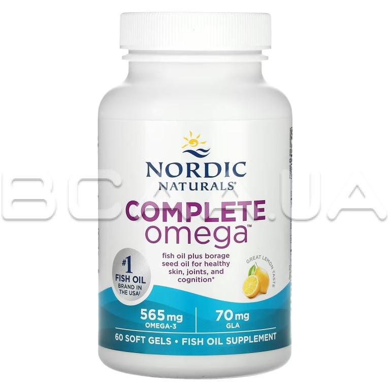- Nordic Naturals, Complete Omega сочетает в себе жирные кислоты омега-3, омега-6 и омега-9 в одной удобной мягкой капсуле для поддержания здоровья всего организма. Формула, полученная из дикой рыбы и масла семян бурачника, способствует здоровью сердца, мозга, суставов и кожи, а также помогает поддерживать сбалансированную реакцию организма на воспаление.