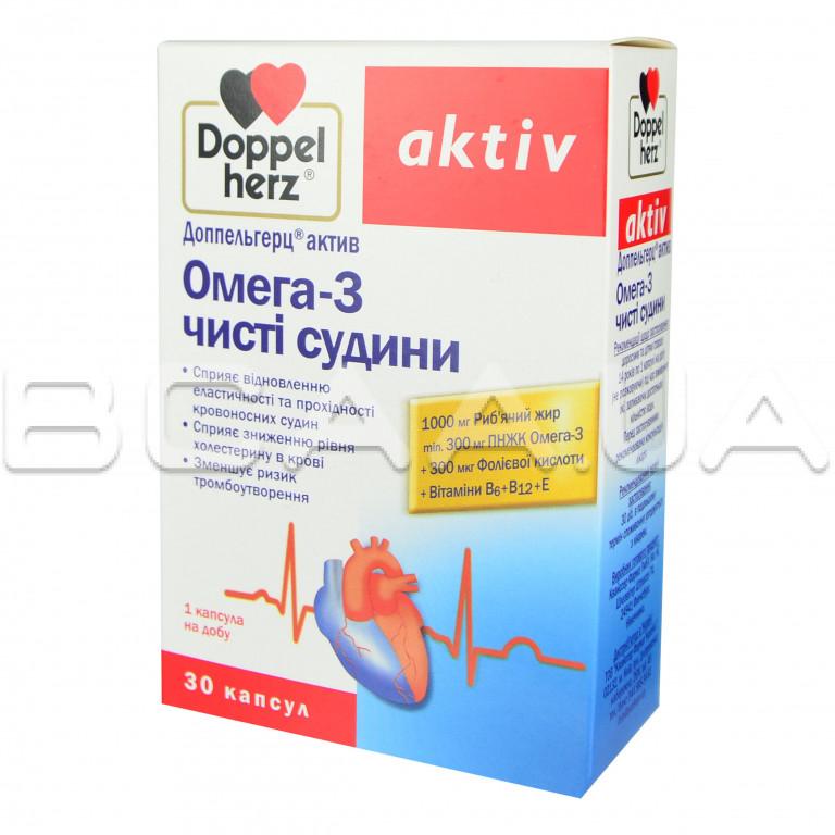 Средство Doppelherz, Актив, Омега-3 Чистые Сосуды, 30 капсул — уникальный комплекс из омега-3 и витаминов, которые принимают непосредственное участие в поддержании здоровья сердца и кровеносных сосудов.