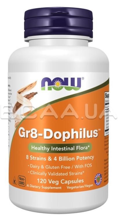 - Now Foods, Gr8-Dophilus™ представляет собой комбинацию 8 различных видов кислотоустойчивых штаммов пробиотических бактерий, которые, как известно, естественным образом колонизируют желудочно-кишечный тракт человека. Пробиотические бактерии имеют решающее значение для здорового пищеварения. Они помогают поддерживать целостность слизистой оболочки кишечника, поддерживают правильную перистальтику кишечника и участвуют в процессе детоксикации. В Gr8-Dophilus™ используются бактериальные штаммы, способность которых поддерживать здоровое функционирование иммунной системы была клинически подтверждена. ФОС (FOS) также включен в этот продукт для содействия здоровому росту микроорганизмов Acidophilus и Bifidus.