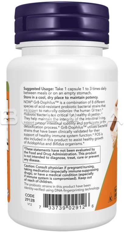 - Now Foods, Gr8-Dophilus™ представляет собой комбинацию 8 различных видов кислотоустойчивых штаммов пробиотических бактерий, которые, как известно, естественным образом колонизируют желудочно-кишечный тракт человека. Пробиотические бактерии имеют решающее значение для здорового пищеварения. Они помогают поддерживать целостность слизистой оболочки кишечника, поддерживают правильную перистальтику кишечника и участвуют в процессе детоксикации. В Gr8-Dophilus™ используются бактериальные штаммы, способность которых поддерживать здоровое функционирование иммунной системы была клинически подтверждена. ФОС (FOS) также включен в этот продукт для содействия здоровому росту микроорганизмов Acidophilus и Bifidus.