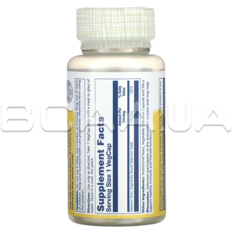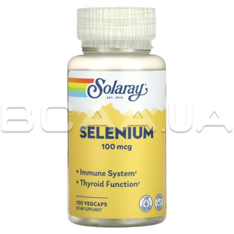 - Solaray, Selenium 100 mcg — это диетическая добавка, которая содержит селен, незаменимый микроэлемент, известный своими антиоксидантными свойствами.
