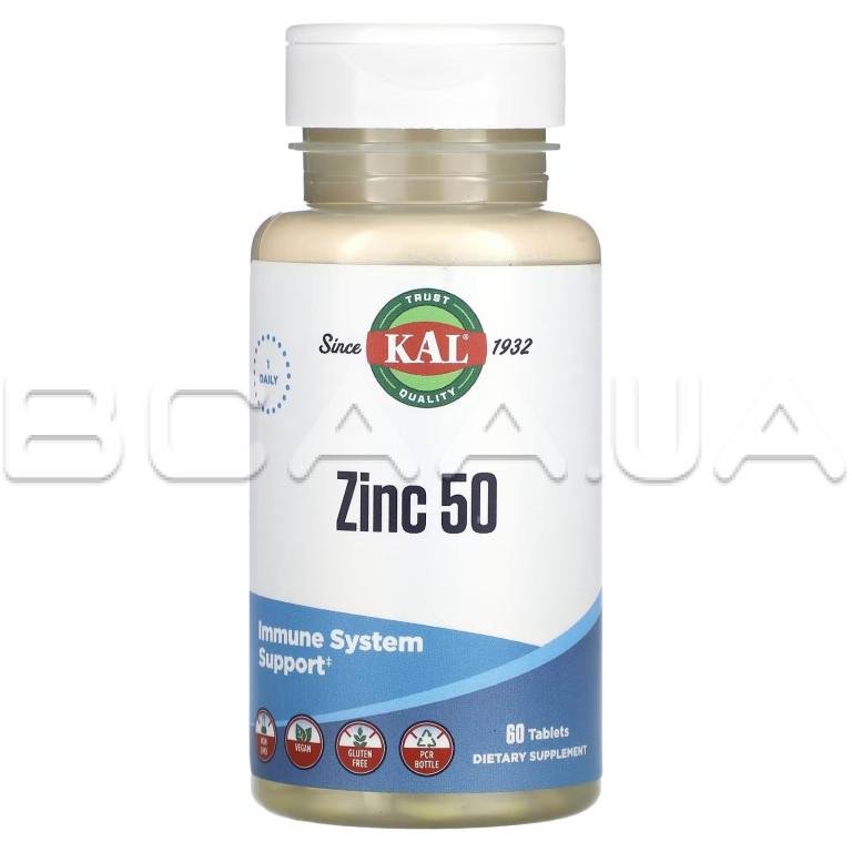 - KAL, Zinc 50 содержит мощную дозу из разных форм цинка, а именно 50 мг на таблетку для поддержания иммунитета, здоровья кожи, антиоксидантной защиты и метаболического баланса. Цинк — незаменимый микроэлемент, участвующий в сотнях ферментативных реакций в организме, способствуя общему жизненному тонусу и хорошему самочувствию. ActiSorb™ Base улучшает усвоение цинка, стимулируя желудочную секрецию и естественную термогенную активность организма.