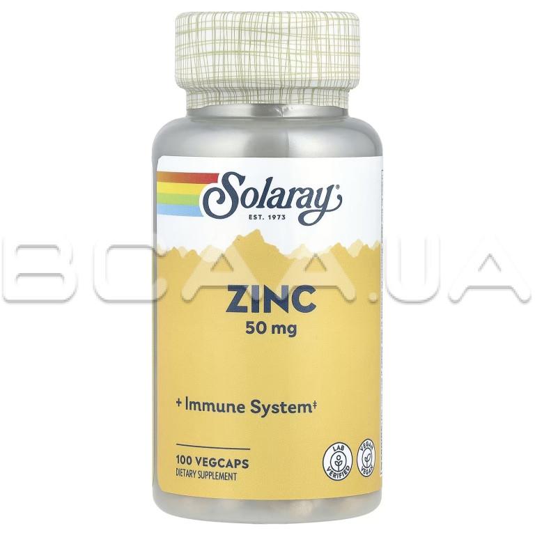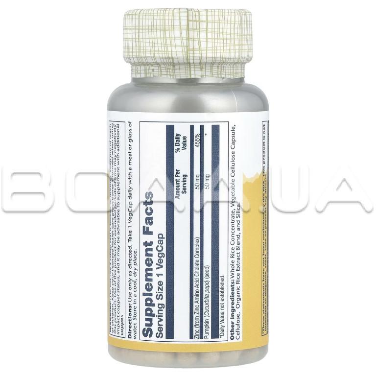 - Аминокислотный хелат цинка от Solaray содержит 50 мг цинка, который связан с аминокислотами для лучшего усвоения и использования. В сочетании с аспарагиновой кислотой, глицином, цельным рисовым концентратом и лимонной кислотой для создания хелатного комплекса эта формула предназначена для более мягкого воздействия на желудок и более легкого усвоения. В состав также добавлены семена тыквы как источник натурального цинка.