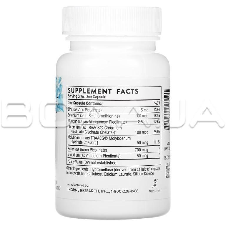 - Исследования микроэлементов продемонстрировали их важность для здоровья человека. Микроэлементы являются кофакторами в многочисленных ферментативных реакциях в организме. Кроме того, они необходимы для правильной работы гормонов и нейротрансмиттеров. Дефицит одного или нескольких из этих микроэлементов может оказать неблагоприятное воздействие на здоровье сердечно-сосудистой системы, костей, фертильности, когнитивного здоровья и иммунной функции. Даже небольшой дефицит микроэлемента может привести к неудовлетворительному росту и развитию. Хотя многие микроэлементы естественным образом присутствуют во фруктах и овощах, истощение минералов в почве привело к тому, что большая часть сегодняшних продуктов испытывает дефицит этих необходимых питательных веществ. В состав добавки Thorne, Pic-Mins входят семь необходимых микроэлементов: цинк, селен, хром, марганец, молибден, бор и ванадий.