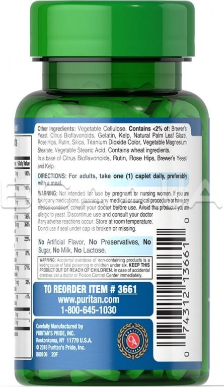 Другие ингредиенты: растительная целлюлоза. Содержит <2%: пивные дрожжи, цитрусовые биофлавоноиды, желатин, водоросли, натуральную глазурь из пальмовых листьев, шиповник, рутин, кремнезем, краситель диоксид титана, растительный стеарат магния, растительную стеариновую кислоту. Содержит пшеничные ингредиенты. В основе цитрусовых биофлавоноидов, рутина, шиповника, пивных дрожжей и ламинарии. Без искусственного вкуса, без консервантов, без сахара, без молока, без лактозы.
