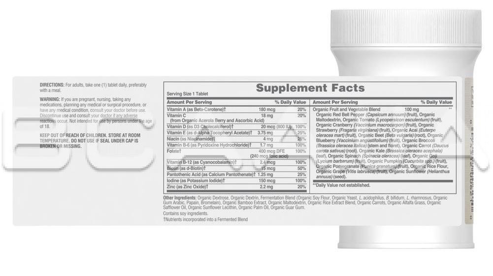 - Смесь органических фруктов и овощей, органический красный перец (Capsicum annuum) (фрукты), органический мальтодекстрин, органический помидор (Lycopersicon esculentum) (фрукты), органическая клюква (Vaccinium macrocarpon) (фрукты), органическая клубника (Fragaria virginiana) (фрукты), Органический Асаи (Euterpe oleracea mart) (фрукты), органическая свёкла (Beta vulgaris) (корень), органическая черника (Vaccinium angustifolium) (фрукты), органическая брокколи (Brassica oleracea italica) (стебель и соцветия), органическая морковь (Daucus carota sativus) (корень), органическая капуста (Brassica oleracea acephala) (лист), органический шпинат (Spinacia oleracea) (лист), органический годжи (Lycium barbarum) (фрукты), органическая тыква (Cucurbita spp.) (фрукты), органический гранат (Punica granatum) (фрукты), органическая рисовая мука, органический виноград (Vitis labrusca) (фрукты), органический подсолнечник (Helianthus annuus) (семена). 100 мг **