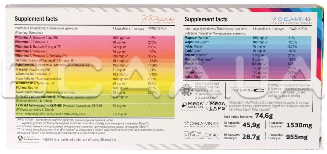 Рекомендации по применению: Принимайте 1 капсулу VITA-PLEX SPORT 40+ и 1 капсулу CHELA-MIN SPORT 40+ один раз в день после основного приема пищи, запивая водой.