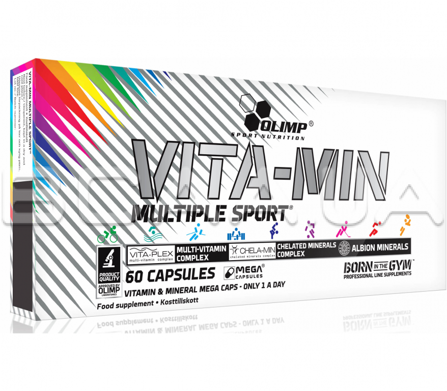 - Olimp labs Vita-min Multiple Sport - содержит все важнейшие витамины и минералы, с недостатком которых может бороться наш организм. Одна капсула покрывает 100% дневного рекомендуемого потребления некоторыми витаминами, а также поставляет высокие количества важных минеральных составляющих в виде хелатов, особенно цинка, магния и йода. Уникальнй чертой пищевой добавки есть дополнительное содержание лютеина (что поддерживает работу органов зрения) и активных соединений из листьев гинкго Билоба, которые тормозят действие свободных радикалов, улучшают процесс кровообращения в мозге и увеличивают приток кислорода и глюкозы в нервных клетках.