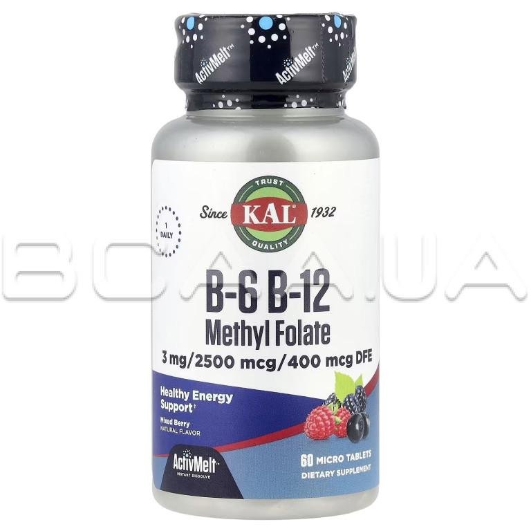 - KAL, B-6 B-12 Methyl Folate сочетает в себе три незаменимых витамина группы B в их биоактивных формах для максимальной эффективности. Эта мощная формула поддерживает энергетический обмен веществ, здоровье сердечно-сосудистой системы, баланс нервной системы и формирование эритроцитов. Благодаря быстрорастворимым микротаблеткам это простой и эффективный способ повысить ежедневный тонус.