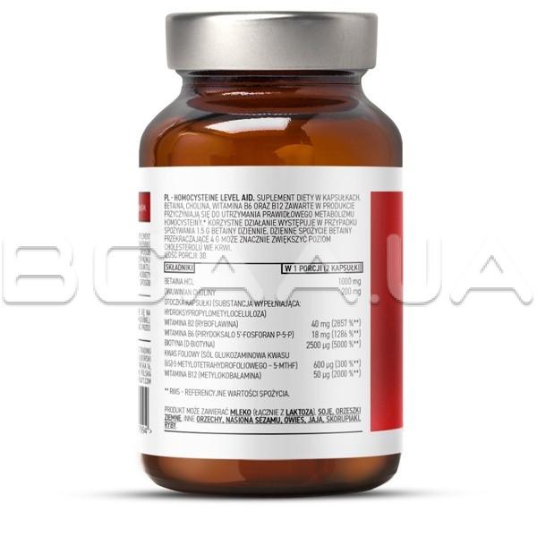 Другие ингредиенты: Бетаин HCL, оболочка капсулы (наполнитель: гидроксипропилметилцеллюлоза), витамин B2 (рибофлавин), витамин B6 (пиридоксаль-5'-фосфат P-5-P), биотин (d-биотин), фолиевая кислота (глюкозаминовая соль кислоты (6S). ) – 5-метил-тетрагидрофолиевая кислота – 5-МТГФ), витамин В12 (метилкобаламин).