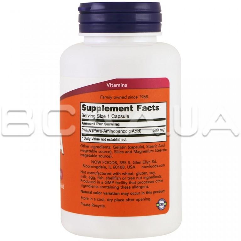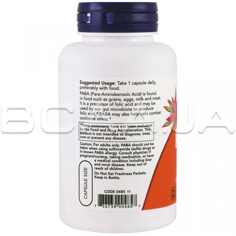 - Now Foods PABA 500 mg - парааминобензойная кислота (ПАБК) , так же известна как витамин В10. Это витаминоподобное соединение из группы витаминов B. ПАБК участвует в синтезе фолиевой кислоты, необходимой для здоровья нервной системы, и в образовании эритроцитов, предупреждая возникновение анемии. Без парааминобензойной кислоты был бы нарушен синтез РНК и ДНК и рост многих видов бактерий, таких как, лакто- и бифидобактерии.