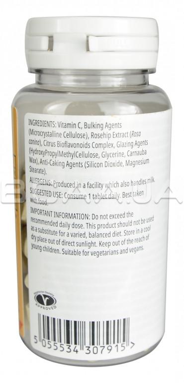 Ингредиенты: Витамин С, наполнители (микрокристаллическая целлюлоза, кроскармеллоза натрия), покрытие (гипромеллоза), экстракт шиповника, биофлавоноиды цитрусовых, агент против слеживания (стеарат магния, диоксид кремния).