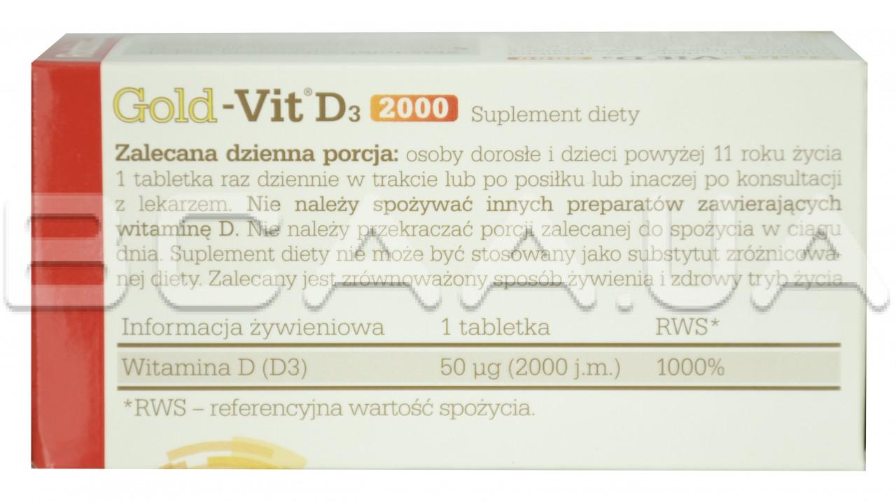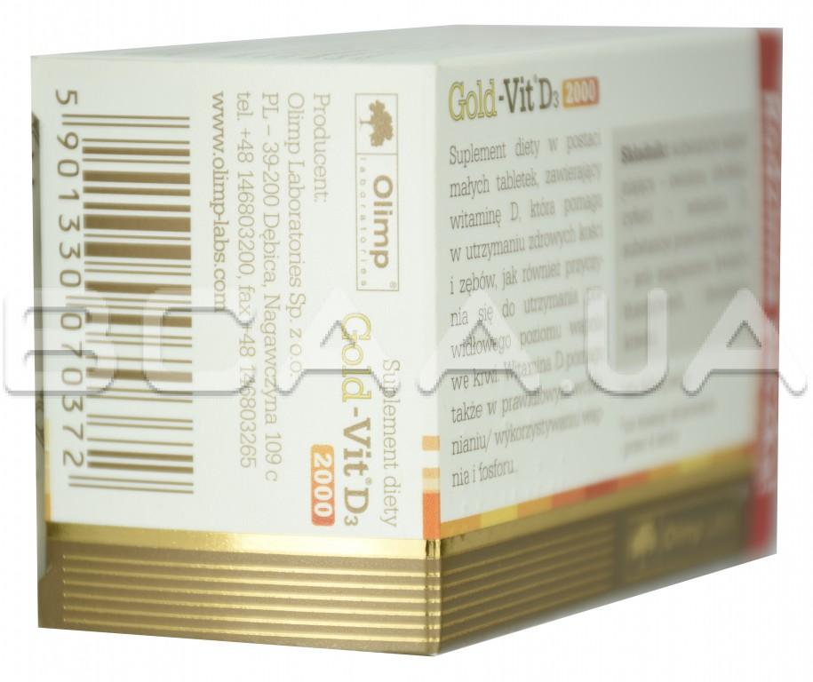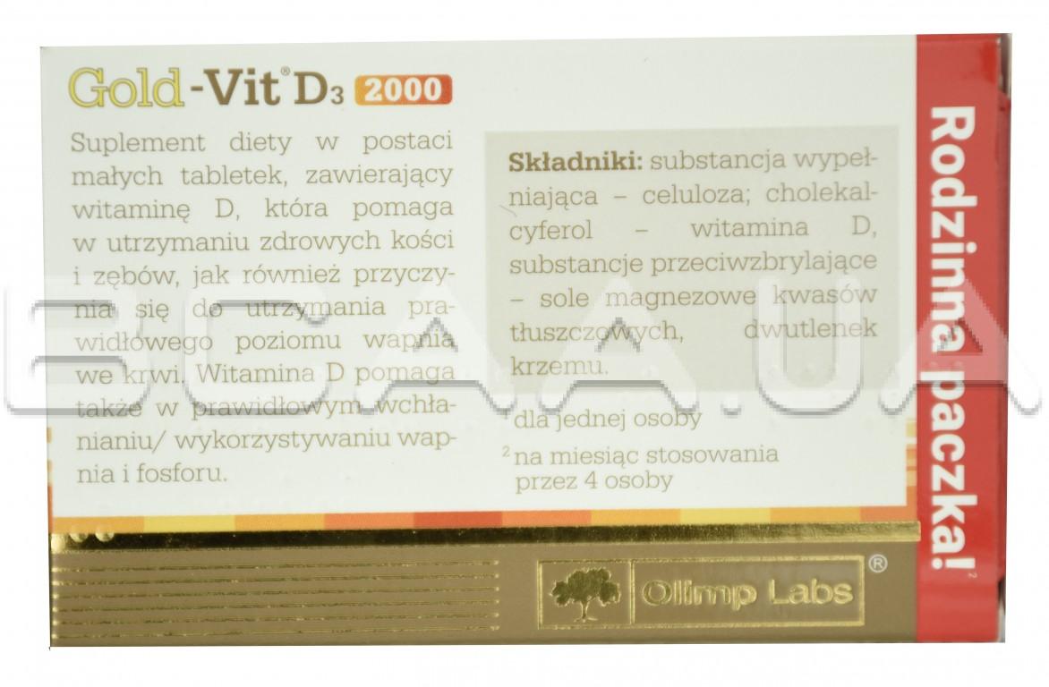 - Gold-Vit D3 2000 - помогает поддерживать здоровье костей и зубов, а также способствует поддержанию необходимого уровня кальция в крови, также помогает в правильном усвоении кальция и фосфора.