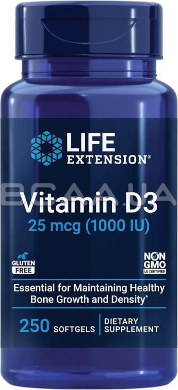 - Life Extension, Vitamin D3 25 mcg (1000 IU) обеспечивает высокоусвояемую форму витамина D для поддержки прочности костей, иммунитета и общего благополучия. Добавка содержит 25 мкг (1000 МЕ) холекальциферола на капсулу и помогает поддерживать оптимальный уровень витамина D для тех, кто может иметь ограниченное пребывание на солнце или повышенные потребности в питании.