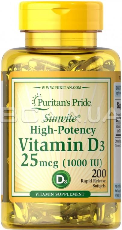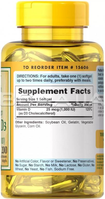 Puritan's Pride, Vitamin D3 (Витамин Д) 25 mcg (1000 IU), 200 Rapid Release Softgels