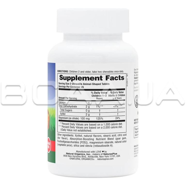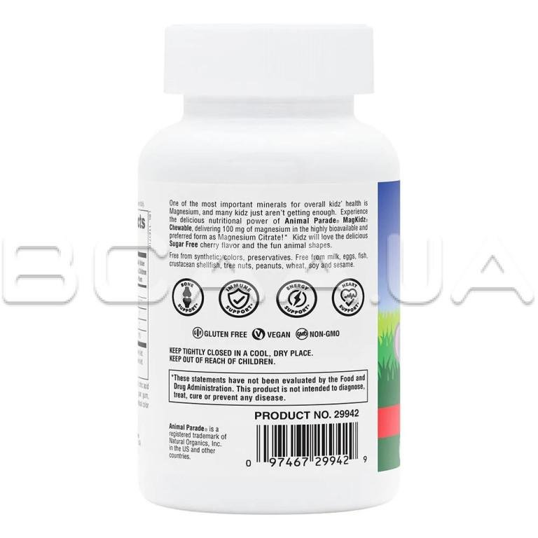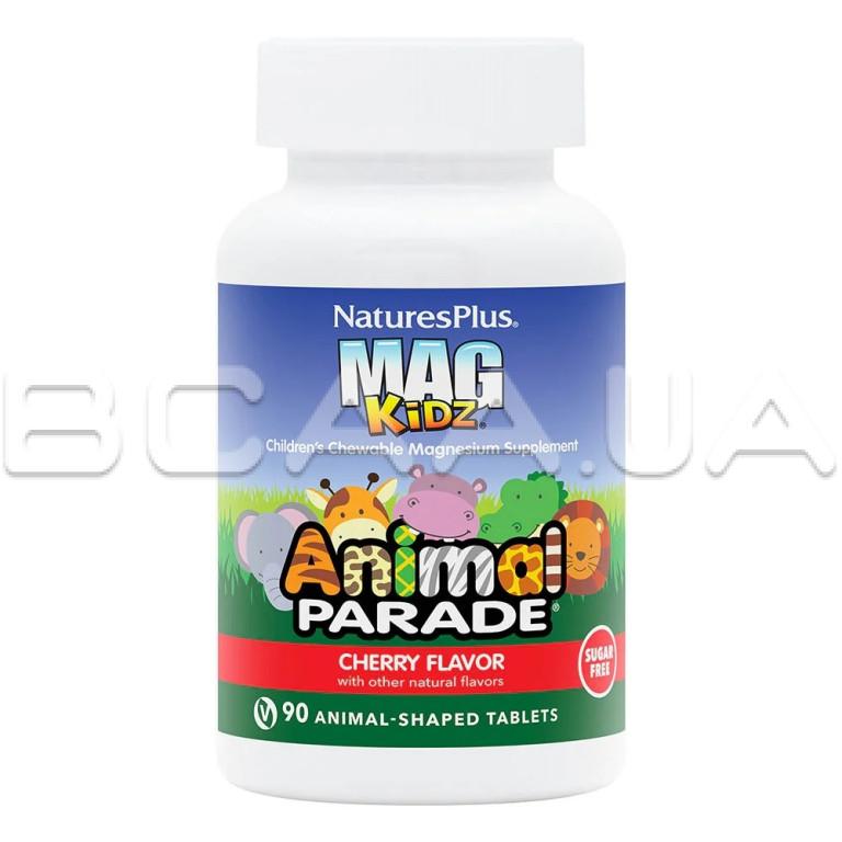 - Natures Plus, MagKidz, Animal Parade — это детская диетическая добавка, разработанная для обеспечения организма необходимым магнием в веселой и вкусной форме. Каждая жевательная таблетка в форме животных содержит 50 мг высокобиодоступного цитрата магния, что в общей сложности составляет 100 мг на порцию из двух таблеток. Таблетки подслащены ксилитом, не содержат сахара, искусственных красителей и консервантов.