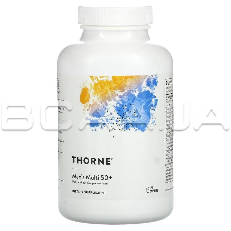 - Thorne, Men's Multi 50+ — это комплексный мультивитаминно-минеральный комплекс, который обеспечивает поддержку здорового, активного образа жизни. Комплекс разработан с использованием питательных веществ, которые организм может легко усваивать, идеально подходит для людей с низким риском дефицита железа. Ежедневный прием этой пищевой добавки обеспечивает ваш организм необходимыми питательными веществами ежедневно, особенно если вы не придерживаетесь сбалансированной диеты. Добавка также содержит оптимальное количество двух ключевых минералов — кальция и магния — в хелатной форме, которая хорошо усваивается.