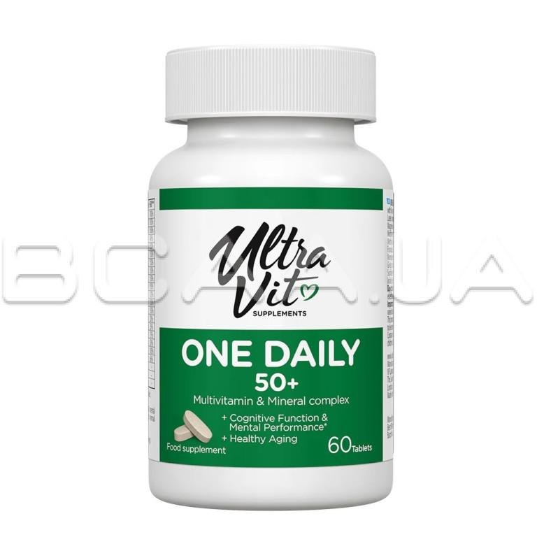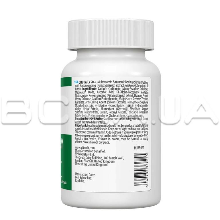 - VPLab, UltraVit, One Daily 50+ состоит из ключевых витаминов и минералов, которые поддерживают весь организм: витамины группы B способствуют здоровью сердца и поддерживают нормальную функцию мозга; витамины А, С, Е и лютеин помогают поддерживать здоровье глаз.