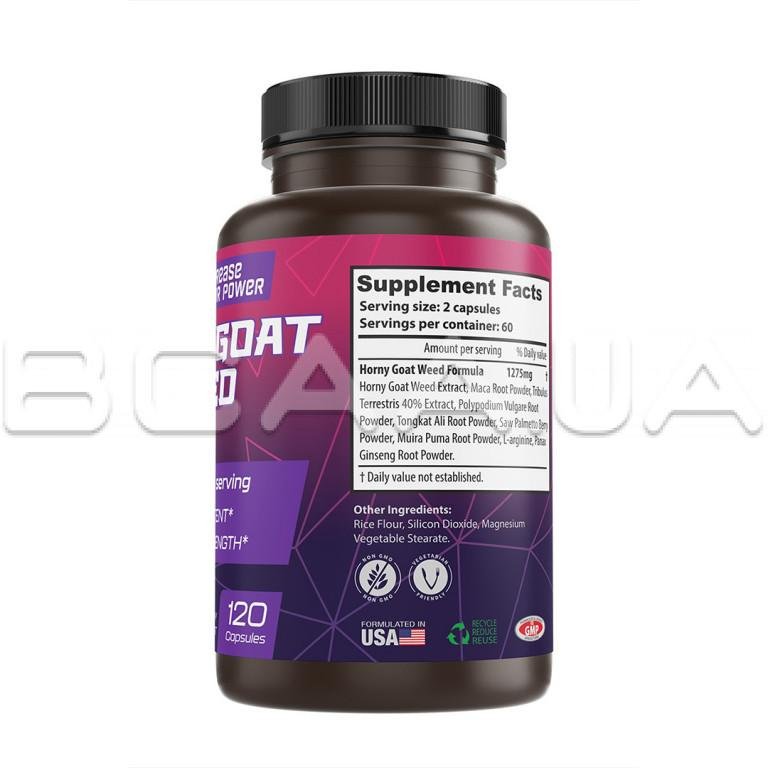 - Horny Goat Weed Formula (Экстракт горянки козлиной, порошок корня маки, экстракт якорей 40%, порошок корня полиподиума обыкновенного, экстракт корня тонгкат али, ягоды из пальметто, порошок корня муиры пумы, L-аргинин, порошок корня женьшеня обыкновенного) 1275 мг