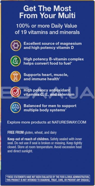 - Nature's Way, Alive!, Men's Complete Multivitamin — высокоэффективная формула, которая содержит 100% суточной нормы или более 19 витаминов и минералов. Кроме того, она содержит высокоэффективные витамины группы B для поддержки вашей ежедневной клеточной энергии.