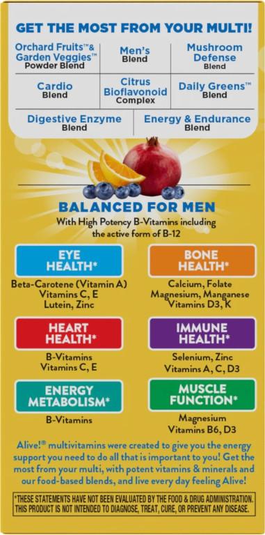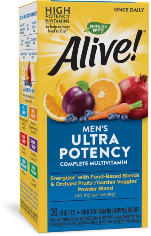 - Улучшите свое здоровье с помощью одной удобной таблетки, наполненной полезными веществами. Alive!® Men’s Ultra Potency Complete Multivitamin — это полноценный поливитамин, разработанный для поддержки вашего энергичного образа жизни. Со 100% дневной нормой 19 витаминов и минералов и 200% дневной нормой 13 витаминов и минералов, включая витамины группы B премиум-класса, которые преобразуют пищу в клеточную энергию, поэтому вы можете отправиться в путешествие, провести время с семьей при этом оставаться активным и энергичным.
