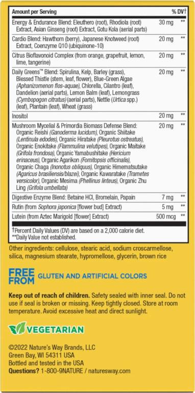 - Смесь Daily Greens™: Спирулина, водоросли, ячмень (трава), чертополох (стебель, лист, цветок), сине-зеленые водоросли (Aphanizomenon flos-aquae), хлорелла (микроводоросли), кинза (лист), одуванчик (надземная часть), мелисса (лист), лемонграсс (Cymbopogon citratus) (надземная часть), крапива (Urtica spp.) (лист), подорожник (лист), пшеница (трава) 20 мг **