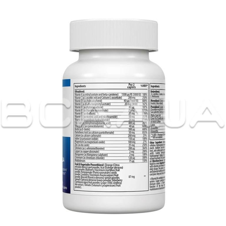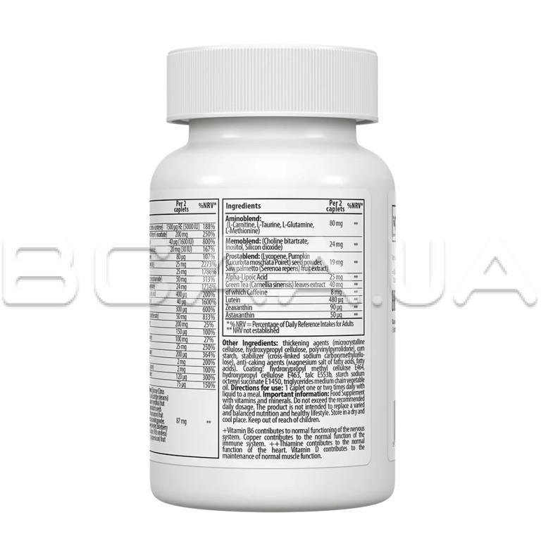 Ингредиенты: карбонат кальция, наполнитель: микрокристаллическая целлюлоза (E460), покрытие капсулы: наполнители: гидроксипропилметилцеллюлоза (E464), гидроксипропилцеллюлоза (E463), антислеживающий агент: тальк (E553b), глазирующий агент: октенилсукцинат натрия крахмала (E1450), триглицериды со средней длиной цепи; L-аскорбиновая кислота, оксид магния, кукурузный крахмал, смесь аминокислот: L-карнитин, L-таурин, L-глутамин, L-метионин; Фруктово-овощная смесь: порошок цедры апельсина (Citrus reticulata Blanco), порошок ягод Асаи (Euterpe oleracea), порошок ягод черники (Vaccinium myrtillus), порошок семян граната (Punica granatum), порошок ягод клюквы (Vaccinium macrocarpon), порошок стеблей брокколи (Brassica oleracea), порошок листьев шпината (Spinacia oleracea), порошок ягод бузины (Sambucus nigra), экстракт кожицы ягод винограда (Vitis vinifera, соотношение 5:1), порошок плодов томата (Solanum lycopersicum); стабилизатор: натрий карбоксиметилцеллюлоза (E468), антислеживающий агент: магниевые соли жирных кислот (E470b), DL-альфа-токоферилацетат, D-пантотенат кальция, загуститель: гидроксипропилцеллюлоза (E463), антислеживающий агент: жирные кислоты (E570); никотинамид, цианокобаламин, L-селенометионин, экстракт листьев зеленого чая (Camellia sinensis, листья; соотношение 5:1), оксид цинка, мононитрат тиамина, гидрохлорид пиридоксина, альфа-липоевая кислота, рибофлавин, смесь ультра плюс: битартрат холина, инозитол, диоксид кремния; холекальциферол, смесь сереноа плюс: ликопин, порошок семян тыквы (Cucurbita moschata Poiret), экстракт ягод сереноа (Serenoa repens; плоды; соотношение 4:1); загуститель: поливинилпирролидон (Е1201), бета-каротин, глюконат меди, L-аскорбат кальция, ниацин, сульфат марганца, ретинилацетат; лютеин, фитоменадион, астаксантин (из порошка водорослей Haematococcus pluvialis), хлорид хрома, зеаксантин (из цветков бархатцев прямостоячих Tagetes erecta L.), птероилмоноглутаминовая кислота, D-биотин, йодид калия, молибдат натрия.
